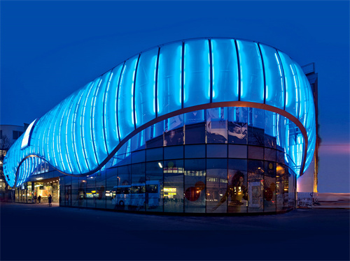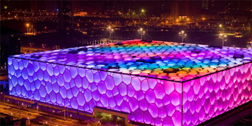 自內(nèi)向外的燈光映射,還常用在ETFE透明膜的建筑上,比如水立方,還有德國慕尼黑安聯(lián)球場。