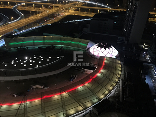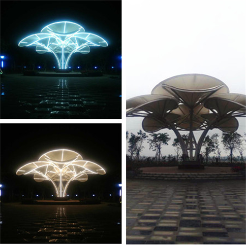 對于透射率低的膜材,其景觀照明往往選擇反射型,將燈光照射到膜材的外表面,利用膜布潔白平整的特點(diǎn),亦可營造出不錯(cuò)的效果。