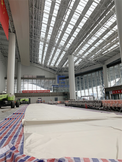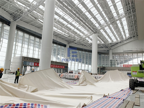 近期,佛蘭空間正在施工的虎門(mén)高鐵站精裝修室內(nèi)天花吊頂就運(yùn)用了PTFE軟膜。
