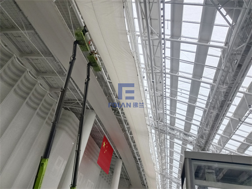 為順利完成100米長的PTFE軟膜吊裝,佛蘭公司派遣了十多名膜安裝施工人員,在卷揚機和高空車的輔助下,耗時8小時,齊心協(xié)力完成了該內(nèi)膜的吊裝及固定。