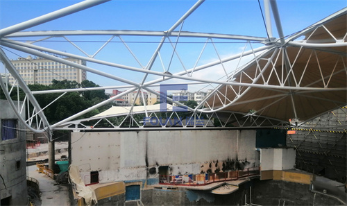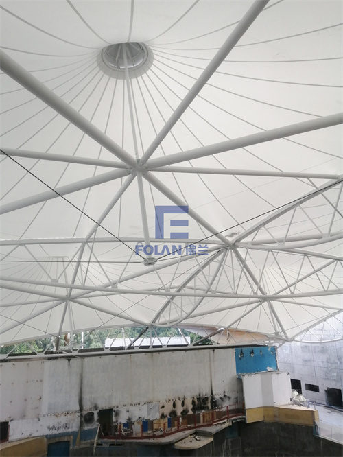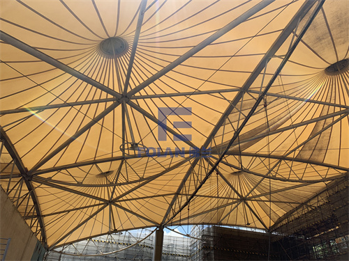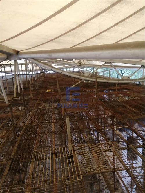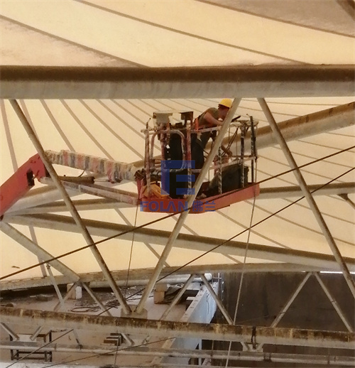 該項目面積約2400平方米,主要施工內(nèi)容包括原有舊鋼結(jié)構(gòu)的除銹翻新、舊膜拆除和新膜的制作、加工、安裝。