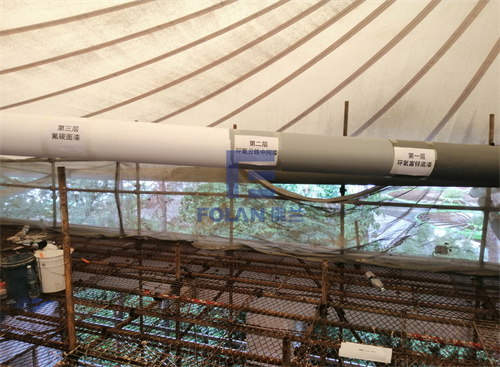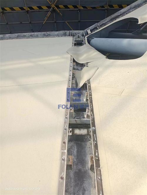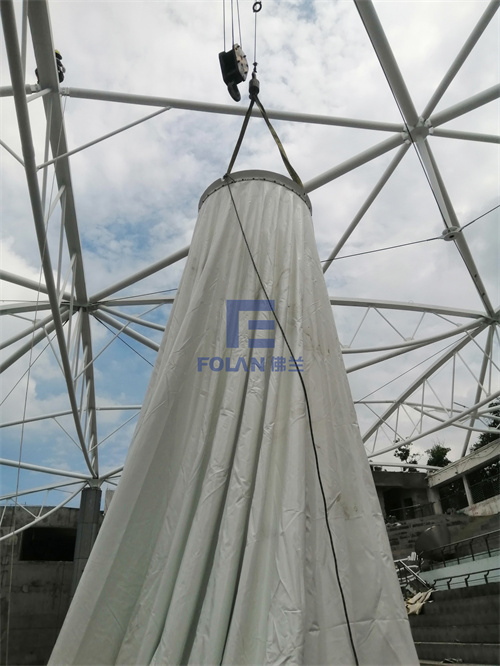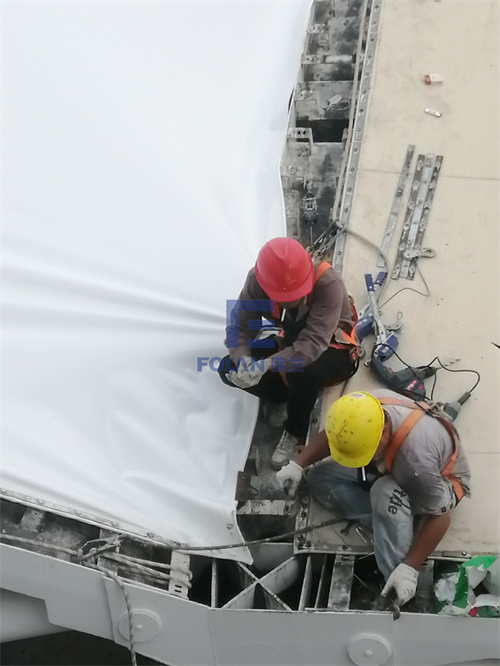 當(dāng)佛蘭空間項目施工人員將所有舊膜和零星固定桿件都已拆除,就要進行新膜的吊裝、安裝及固定等施工步驟。該項目新膜材選用的是進口法拉利1202S2高自潔PVDF膜,防霉防腐性能好,能長久保持其表面潔白美觀。