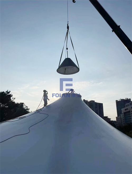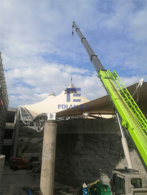 該項目造型獨特輕盈,由6個帽子和1段弧拱索邊拼接而成,在新膜的安裝過程中,施工人員先將裁剪好的帽型膜材進行吊裝與安裝,然后再吊裝不銹鋼鋼帽,最后是帽子旁邊一段索邊弧拱膜材的吊裝與安裝。