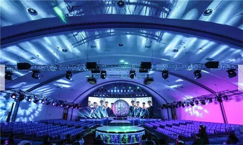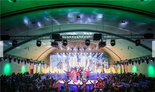2019年“琴嶼秀”演出的室內版水上舞臺便是在這多功能廳搭建的,國宴廳頂部大曲面的波浪造型象征海浪,有序變化的燈帶以海鷗圖形做點綴,室內門采用白銅蝕刻泰山圖案,銅質水紋雕刻的貝殼做門把手,體現(xiàn)海洋文化、青島特色,營造了愉悅、歡快的迎賓氛圍,室內面積超過1000平米,具備了搭建演出平臺的良好基礎。