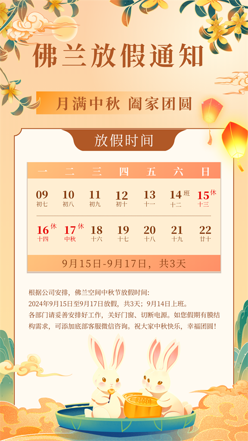 秋風(fēng)輕拂,桂香四溢,我們即將迎來(lái)一年一度的中秋佳節(jié)。在這溫馨而美好的時(shí)刻,佛蘭空間全體成員向您及您的家人致以最誠(chéng)摯的節(jié)日祝福:中秋快樂(lè),闔家團(tuán)圓!