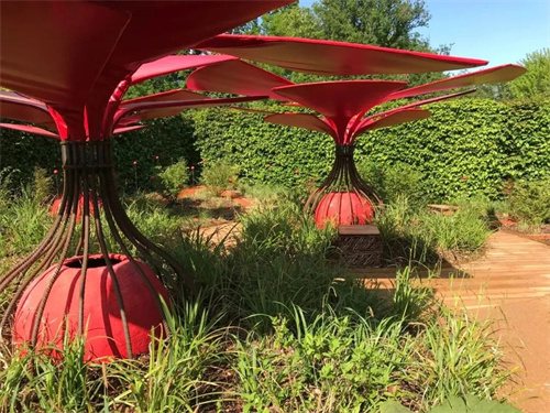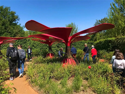 在去年舉辦的第30屆盧瓦爾河畔肖蒙國際花園節(jié)中,展示了很多新品花卉及創(chuàng)新展示方案,其中這個紅色花形景觀膜最具象征意義,它能啟發(fā)人們更多參與良性生態(tài)循環(huán),并警醒人們對水資源的價(jià)值認(rèn)識。