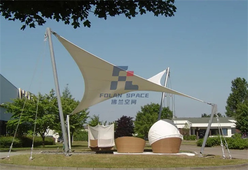 它優(yōu)雅地伸展,以極致的輕盈,覆蓋廣闊的空間。那流暢的曲面,并非軟弱,而是以柔克剛的智慧。高強(qiáng)度膜材在精密鋼索的牽引下,形成強(qiáng)大的張力,穩(wěn)穩(wěn)地?fù)纹鹨黄?。烈日?dāng)空,它溫柔地濾去灼熱,投下舒適的蔭涼;暴雨傾盆,它堅(jiān)定地遮蔽風(fēng)雨,守護(hù)一方干爽。它不言不語(yǔ),卻以絕對(duì)的可靠,成為下方空間最堅(jiān)實(shí)的依靠。