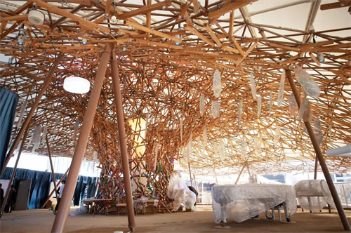 在“創(chuàng)造之樹(shù)”的內(nèi)部是藝術(shù)家長(zhǎng)坂真護(hù)與中島制作人合作的垃圾藝術(shù)裝置“海月“,這是一個(gè)通過(guò)五感與互動(dòng)裝置探索聲音與光線的體驗(yàn)裝置,站立裝置正下方時(shí),可聽(tīng)到創(chuàng)作者二人的鋼琴聲從頭頂傾瀉。