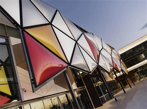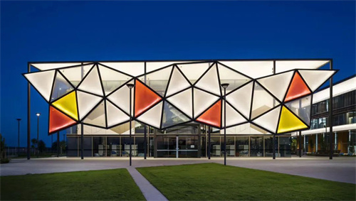 新的OranPark圖書館外立面,由31個三角形氣枕組成,氣枕設計成四種顏色:紅色,黃色,白色以及透明鍍點,以此滿足不同部位室內環(huán)境對陽光的需求。背面均采用透明ETFE膜,此外還增加了LED照明系統(tǒng),為夜間增加不同的視覺效果。