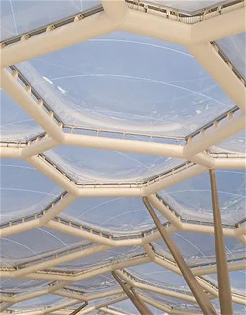 展館的功能性和多功能建筑結構是一系列連續(xù)的拱形元素,中央空間有一個庭院,而建筑的屋頂燈就是采用的半透明ETFE氣枕膜結構。