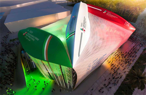 迪拜世博會意大利館的屋頂由一系列不同形狀和尺寸的ETFE氣枕組成,覆蓋面積約為1600平方米。膜結構氣枕形成了一個蜿蜒的表面,就像大海和沙漠的波浪一樣。設計采用了桔皮、咖啡渣、菌絲體和從海洋中提取的再生塑料等材料作為建筑元素,以此展現(xiàn)建筑的可持續(xù)性和環(huán)保原則。