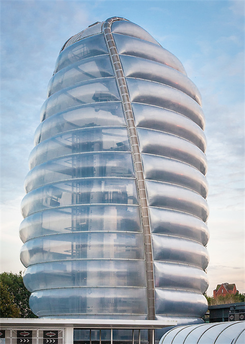 這個37米高的外殼由一個裸露的鋼斜架建造,外覆一層半透明的墊層,墊層由聚氟乙烯(ETFE)和輕質特氟隆聚合物制成,稱為氣枕式ETFE膜結構。這種材料具有絕緣玻璃的隔熱性能,而僅相當于絕緣玻璃的一小部分重量。