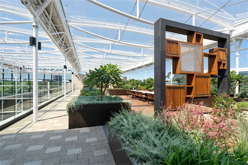 ETFE屋頂覆蓋了兩座建筑的頂層屋頂花園,并在藝術區(qū)建筑的中間形成了一個內部中庭,將麥考瑞大學藝術區(qū)大樓連接在一起。
