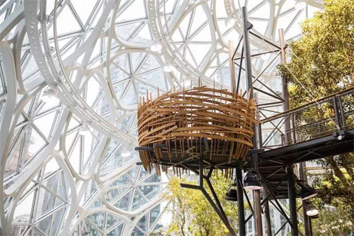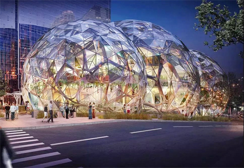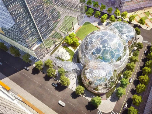 AmazonSpheres是項目最核心的“熱帶雨林"部分,由3個大的球狀體組成,其中最大的球狀體直徑39米,高27米,共四層。據(jù)說,整個建筑使用了2643片透明玻璃和620噸鋼。