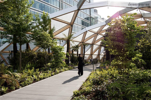 2008年,Gillespies受金絲雀碼頭集團的委托,創(chuàng)建了一個獨特的、部分封閉的高架公共花園,花園部分被一個獨特的木柵格ETFE屋頂包圍,像一個保護殼一樣包裹著建筑。