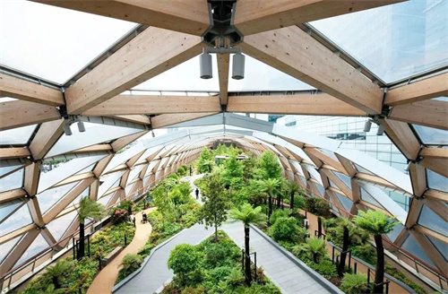 這個300米長的木柵格ETFE屋頂在中心開放,引入自然光線和雨水進行自然灌溉,同時提供與北面楊樹社區(qū)的視覺聯(lián)系。ETFE氣枕的使用,不僅為不耐寒植物物種提供了有利的氣候環(huán)境,還為人類提供了全年享受舒適花園環(huán)境的可能。