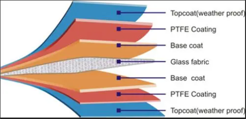 PTFE,G類膜材,采用浸漬涂層法,是在超細玻璃纖維基布上涂覆PTFE樹脂而成的復合材料。