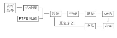 經(jīng)過浸漬后,玻纖布表面涂上了薄薄一層氟樹脂,再經(jīng)過干燥、烘焙、燒結(jié)等工序,達到玻纖布與PTFE牢固結(jié)合的目的,成為一種既具玻纖特性,又有PTFE諸多優(yōu)異性能的新型材料。