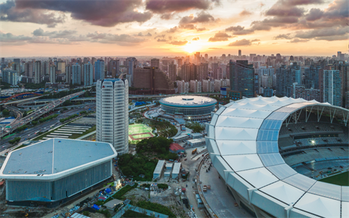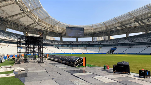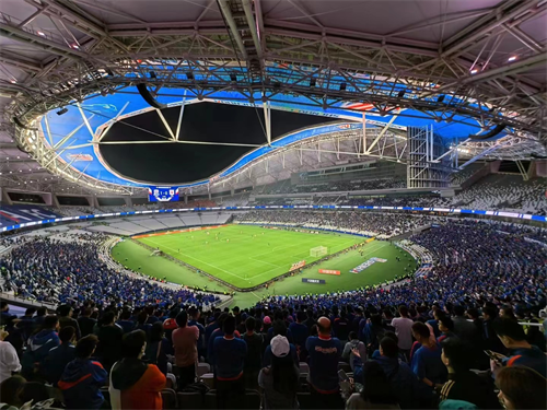 現(xiàn)場歌聲繞梁,抬頭仰望,整個會場也壯觀浪漫。最值得一提的是會場屋面鋼結構懸挑延伸部分下掛的LED發(fā)光天幕、上覆ETFE透明膜,安裝360°環(huán)繞擴聲裝置,為賽事現(xiàn)場呈現(xiàn)出震撼的聲光電效果,帶給觀眾國際頂級賽事的沉浸觀感。