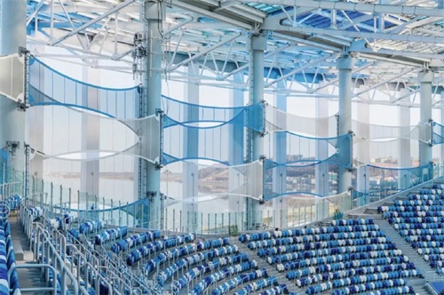 卡塔爾AlJanoubStadium體育場(chǎng)是座可容納4萬(wàn)人的足球場(chǎng),體育場(chǎng)的可伸縮式屋頂采用了PTFE膜材,展開時(shí)屋頂就像一個(gè)船帆,覆蓋在球場(chǎng)的上方,為夏天足球比賽創(chuàng)造了一個(gè)遮蔽的環(huán)境。