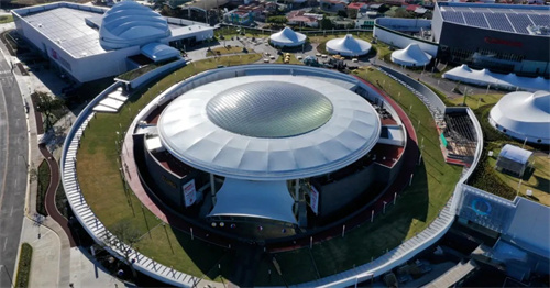 位于哥斯達(dá)黎加的Oxigeno是一個(gè)14.5萬(wàn)平方米的購(gòu)物娛樂(lè)目的地,是世界上最大的屋頂公園之一。其美食廣場(chǎng)的屋面采用ETFE氣囊式膜結(jié)構(gòu)。氣囊直徑45m,投影面積1600m2,ETFE膜材厚度0.25mm。采用索網(wǎng)加強(qiáng),索網(wǎng)的網(wǎng)格尺寸1.2m。