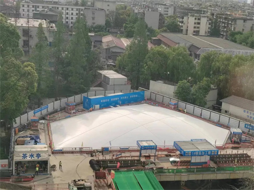 四川省人民醫(yī)院綜合科研大樓建設(shè)項(xiàng)目中的氣囊式基坑氣膜是目前我國(guó)西部地區(qū)建筑工地基坑施工中首次應(yīng)用的“氣囊式”充氣膜,氣膜覆蓋面積約1200平方米,最大跨度達(dá)44米,高度6米,是一種兼具防塵性、降噪性、便捷性、智能性和安全性的新型基坑氣膜。該氣膜采用強(qiáng)度大、耐久、耐高溫紫外線的PVDF新型建筑材料,通過(guò)雙層膜+保溫棉的方式結(jié)合,具有非常顯著的隔音和保溫隔熱效果。