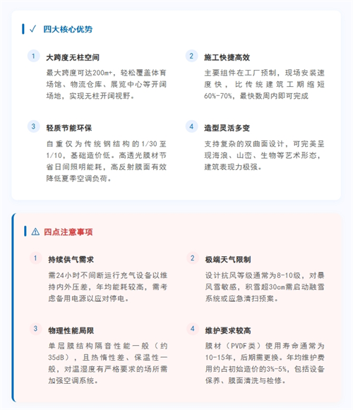 氣承式膜結(jié)構(gòu)以其獨(dú)特的輕盈、靈活和大跨度優(yōu)勢(shì),在現(xiàn)代建筑中占據(jù)重要地位。盡管存在一定局限性,但隨著材料科學(xué)與工程技術(shù)的進(jìn)步,其應(yīng)用前景仍然廣闊,未來(lái)或?qū)⒃诳沙掷m(xù)建筑和臨時(shí)設(shè)施領(lǐng)域發(fā)揮更大作用。
