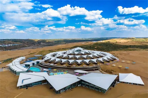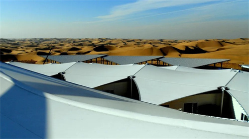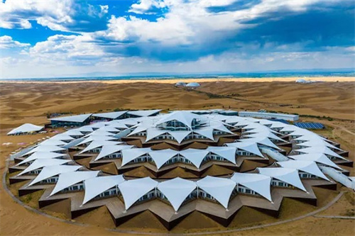 膜結(jié)構(gòu)以“蓮花”為靈感,通過(guò)層層張拉膜模擬蓮花的形態(tài),既呼應(yīng)沙漠中沙丘的曲線,又形成獨(dú)特的視覺(jué)景觀。這種設(shè)計(jì)不僅美觀,還充分考慮了沙漠環(huán)境中的日照、風(fēng)沙等因素,實(shí)現(xiàn)了功能與形式的統(tǒng)一。采用輕鋼結(jié)構(gòu)作為支撐,搭配高強(qiáng)度膜材,既減輕了建筑自重,又通過(guò)特定的鋼板固定流沙,形成類(lèi)似“沙海浮舟”的獨(dú)特地基基礎(chǔ),確保在沙漠環(huán)境中保持穩(wěn)定。