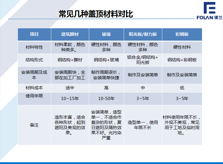 常見屋頂覆蓋材料,通過下表進行對比??梢?,膜結(jié)構(gòu)的性價比好。