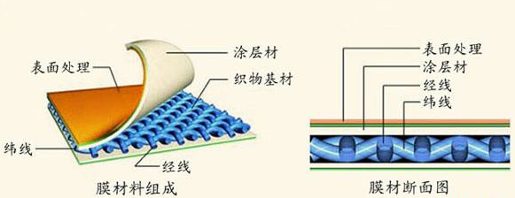 如下圖,膜材是由基布和表面涂層組成。
