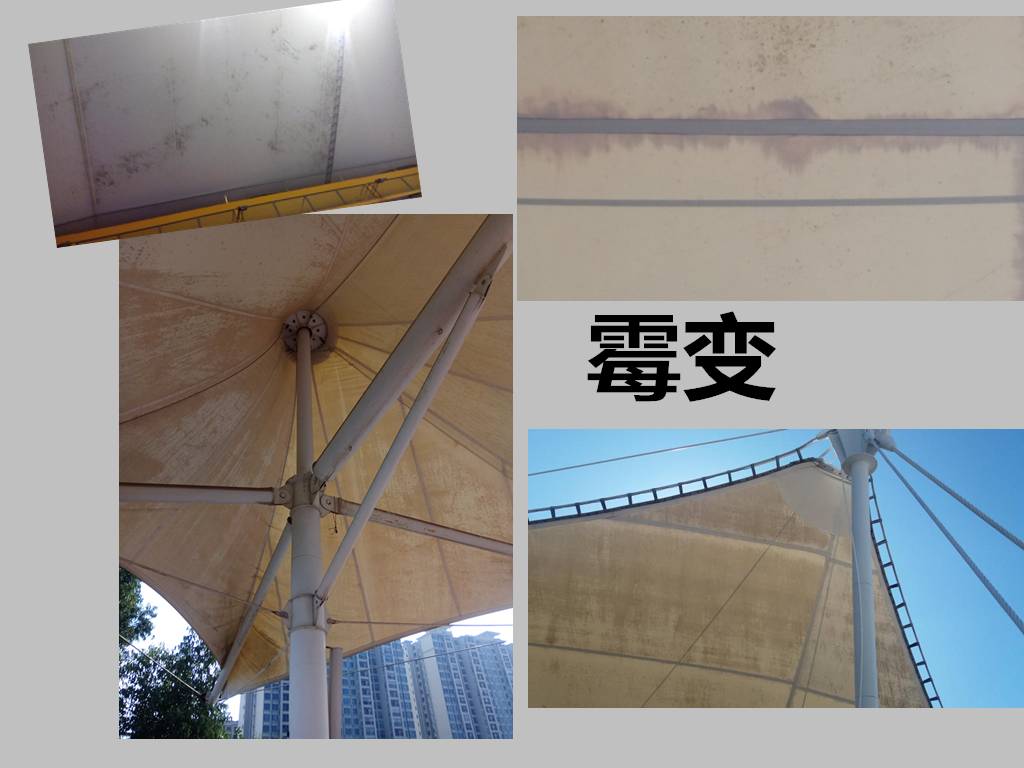 一些劣質(zhì)的膜材,往往通過少涂或者不涂自潔涂層,或涂刷其他材料(如清漆)等來降低生產(chǎn)成本,以達到低價競爭的目的。而客戶又很難通過肉眼去分辨膜材表面涂層是否被造假。一般,完工后1年左右,使用劣質(zhì)膜材的工程會出現(xiàn)膜體松動、徐變,膜材出現(xiàn)霉斑、黑點、更有甚者會出現(xiàn)表涂層剝離脫落。3年后,霉斑連成片,膜基布里的絲霉斷,強度減弱,遇大風一吹,形成破洞、裂縫,最終破損報廢。