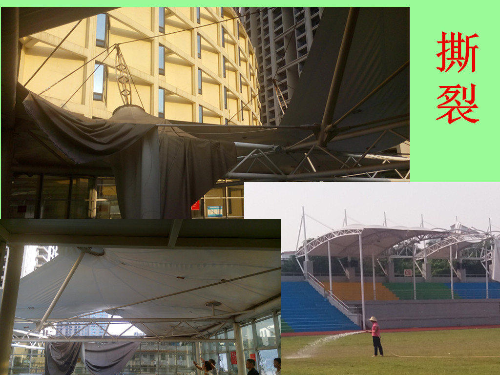 目前許多數(shù)膜結(jié)構(gòu)工程基本都是這樣的問題。即采用了劣質(zhì)材料引起的外觀破損骯臟。