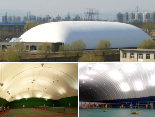 1.充氣膜結構:一般由圈梁基礎、膜體、充氣機械系統(tǒng)、控制與監(jiān)控系統(tǒng)、電設計系統(tǒng)和進出口系統(tǒng)組成(空調與新風機選配)。
