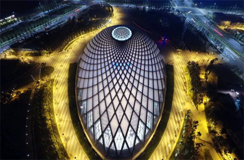 其復(fù)雜優(yōu)美的網(wǎng)格形式在國內(nèi)大跨度鋼結(jié)構(gòu)領(lǐng)域?qū)儆谑讋?chuàng),同時,將支座設(shè)計成雙球鉸鋼支座,也是國內(nèi)網(wǎng)殼結(jié)構(gòu)的首例。