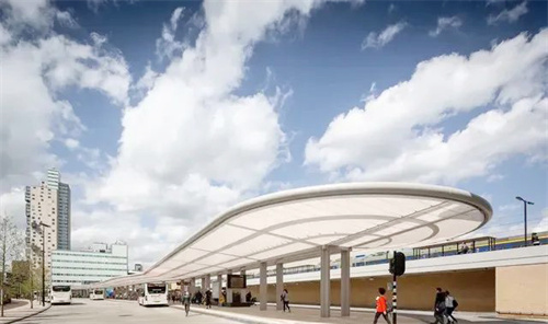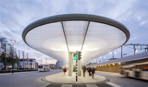 耐用、輕便且耐候的材料使設(shè)計師能夠?qū)⒔Y(jié)構(gòu)塑造成引人注目的球形。建筑師選擇在中間打開結(jié)構(gòu)以提供額外的日光,創(chuàng)造一個令人愉悅的環(huán)境,旅客可以在等待公共汽車時聚集在一起交談。