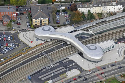 兩個位于鐵路兩側(cè)的圓頂建筑通過橫跨鐵路的天橋連接起來,材料是ETFE和鋁飄帶。螺旋狀的通道將乘客引入其中。設(shè)計通過忽略場地的方式對周圍環(huán)境和建筑做出回應(yīng)。其圓潤的形體模糊了屋頂和墻面、橋梁與建筑的范圍,乘客將在這里感受到一種獨特的異構(gòu)空間。