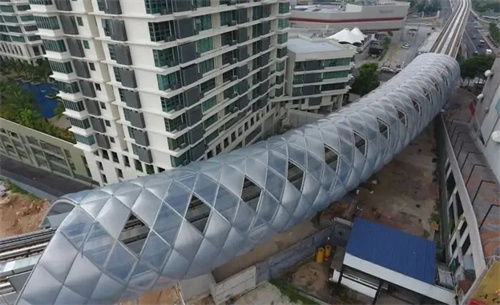 Kelana Jaya LRT Line Tunnel被譽為吉隆坡第一條“空中隧道”,于2016年3月開通,由ETFE氣枕包覆到扭曲的鋼結(jié)構(gòu)格子構(gòu)成,2500平方米的ETFE氣枕,由建筑師設(shè)計以創(chuàng)造一個“破碎”的表面,氣枕是透明,并印有厚重的銀色印刷,以在整個覆層上產(chǎn)生圖案。