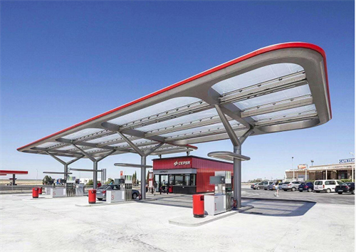 CEPSA公司是西班牙第二大石油公司,位于西班牙阿維拉的加油站設(shè)計基于品牌高技術(shù)和優(yōu)質(zhì)服務(wù)的特點,以樹木為意向,設(shè)計加油站雨棚、泵站、照明與標(biāo)志。雨棚采用模塊化組織、可自潔的高科技ETFE材料,不僅重量輕并且可回收利用,夜晚柔光的紅色增添一絲暖意。