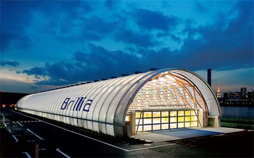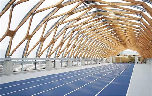 新豐洲跑步館是日本第一家使用ETFE薄膜的體育場館,與其搭配的結構支撐材料除了常用的合金框架外,還使用了松木框架。這使得整個建筑有更親人的感官體驗,同時還提高建筑的輕盈感。