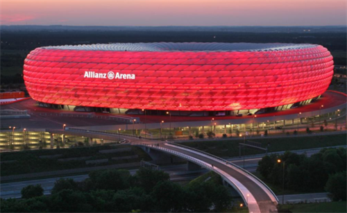 安聯(lián)球場外墻體由2874個氣墊構成,其中1056個在比賽中可以發(fā)光。它外立面使用ETFE氣枕,內嵌發(fā)光系統(tǒng),可使外墻分別發(fā)出紅光(當球場作為拜仁慕尼黑隊的主場時)、藍光(當球場作為慕尼黑1860隊的主場時)或白光(德國國家隊隊服的顏色)。