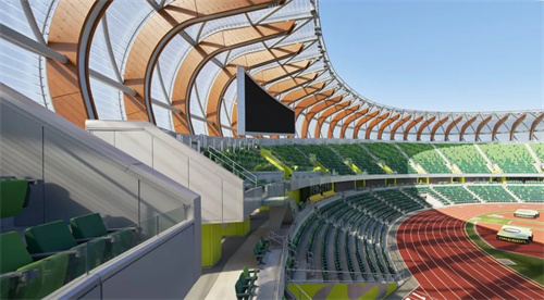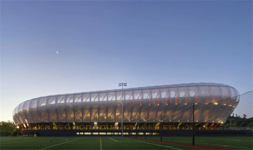 翻新后的俄勒岡大學田徑場,是世界上最具創(chuàng)新性的田徑場之一。圍墻使用了鋼結構+木結構,并在外層包覆ETFE薄膜。木頭的重要性可以追溯到1974年,它旨在展示俄勒岡州的歷史和文化,突出林產品。
