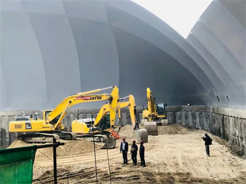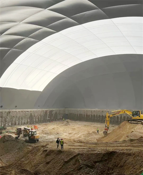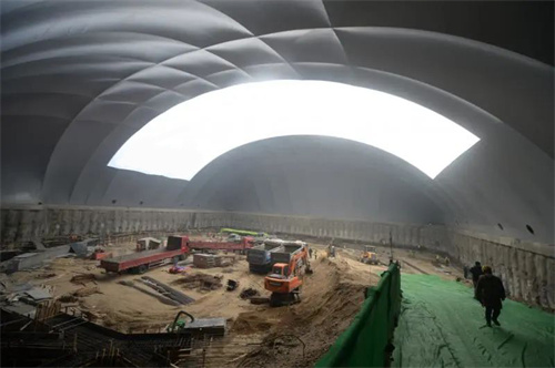 “基坑氣膜”建筑是采用內(nèi)外氣壓差支撐的新型建筑結(jié)構(gòu),再利用斜向網(wǎng)狀結(jié)構(gòu)加以固定,將膜材固定于地面基礎(chǔ)結(jié)構(gòu)周邊,利用供風(fēng)系統(tǒng)讓室內(nèi)氣壓上升到一定壓力后,使屋頂內(nèi)外產(chǎn)生壓力差以抵抗外力,由于利用氣壓來(lái)支撐,無(wú)需任何梁、柱,所以可得到更大的完全凈空的建筑空間。