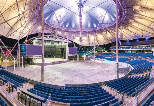 哈特福特市醫(yī)療保健機(jī)構(gòu)圓形劇場采用發(fā)光聚四氟乙烯涂層玻璃織物。在穹頂桅桿接觸屋頂織物的部位,FTL使用四氟乙烯箔皮以獲取更多的光線射入。同時,在穹頂和下部圍護(hù)結(jié)構(gòu)之間采用黑色網(wǎng)狀織物提供被動散熱能力。