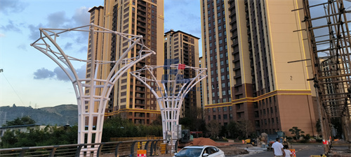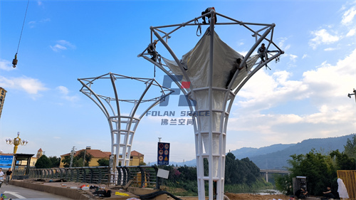 為提升小區(qū)時(shí)尚美觀性及豐富小配套服務(wù),業(yè)主方在小區(qū)興建了兩處膜結(jié)構(gòu)大門,其中一處呈拱型,簡(jiǎn)約大氣。另一處呈喇叭花型,四朵喇叭花拽拉著兩個(gè)吊帽,造型獨(dú)特。