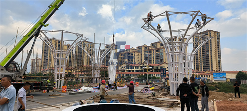 喇叭花鋼構(gòu)呈白色,頂部用鋼球連接,美觀堅(jiān)固。在膜安裝過(guò)程中,佛蘭項(xiàng)目施工人員先要戴好安全帽,綁好安全繩,蹲在喇叭花型鋼構(gòu)的幾個(gè)端點(diǎn),等吊機(jī)把膜吊裝到喇叭花鋼構(gòu)內(nèi),工人們就齊心協(xié)力,通力合作,慢慢把膜材展開(kāi),張拉及固定。