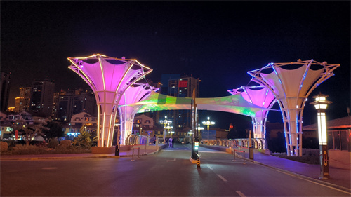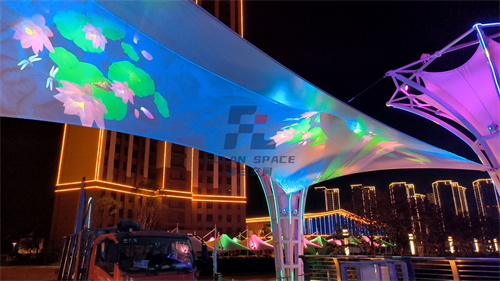 完工后的喇叭花膜結(jié)構(gòu)大門,在藍(lán)天白云的映襯下,格外引人注目。最值得一提的是其夜景,膜結(jié)構(gòu)大門自成投影天幕,獨(dú)樹一幟,各種圖案,夢(mèng)幻多彩。
