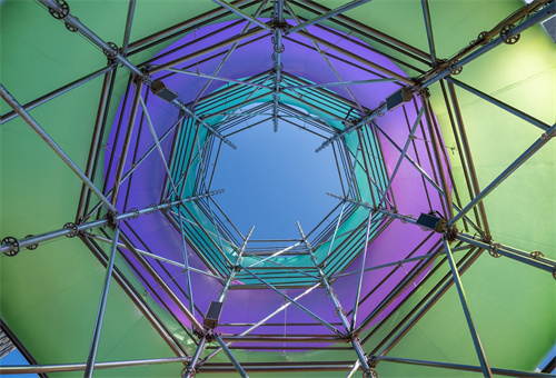 光塔的中心結(jié)構(gòu)由銀色不銹鋼管構(gòu)筑,經(jīng)過(guò)多輪設(shè)計(jì)推敲后,形成雙層嵌套式的中空七邊形結(jié)構(gòu),內(nèi)外層間距約30厘米,產(chǎn)生穩(wěn)定的拉力。大星吉子設(shè)計(jì)工作室特別選用了盤(pán)扣式不銹鋼腳手架,其圓盤(pán)型的節(jié)點(diǎn)適應(yīng)多方位的連接,并與裝置整體形態(tài)呼應(yīng);鋼架底端埋入深約1米的預(yù)設(shè)地基中,以確保結(jié)構(gòu)穩(wěn)固和水平。整體結(jié)構(gòu)簡(jiǎn)潔而精巧,使觀眾在裝置內(nèi)部仰視這座光影變幻的高塔時(shí),視線亦能通透無(wú)遮擋地望向天空。