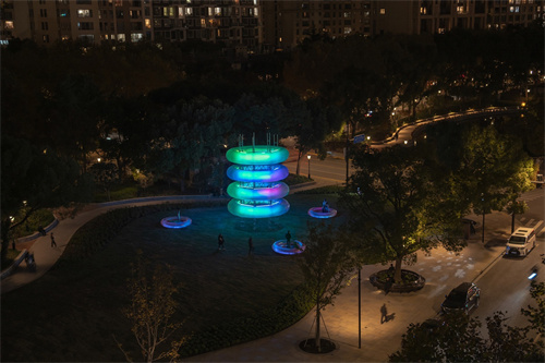 主裝置的設(shè)計(jì)靈感源自20世紀(jì)30年代為粒子加速器提供高直流電壓的考克饒夫特-瓦爾頓發(fā)電機(jī)(Cockcroft-Waltongenerator),大星吉子設(shè)計(jì)工作室期望通過(guò)設(shè)計(jì)傳達(dá)這種向上的力量感,同時(shí)給予其充分的交互性,讓積極的跳躍行動(dòng)去賦予城市空間能量。